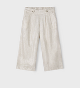 Flott bukse med vide ben til jente. Elastisk midje med pynteknapper foran. Laget i en fantstisk viskose- og linblanding som passer utmerket på varme sommerdager. Denne bukse kan pyntes opp og ned alt ettersom hvilken anledning den brukes i. Buksen har litt shimmer i seg som gir det lille ekstra.