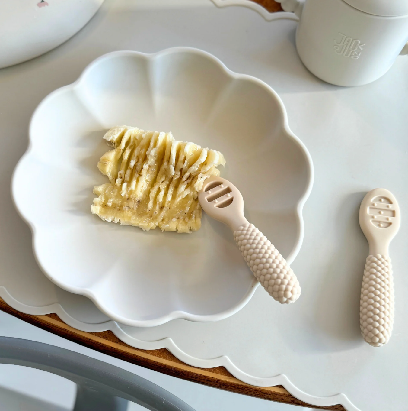 Våre Pre-Skjeer er utviklet for å gjøre overgangen til selvstendig spising enklere for babyen din. Trinn 1 har en solid overflate som passer perfekt til glatte puréer. Når barnet blir litt eldre, kan det gå over til Trinn 2, som har åpne spor og egner seg godt til tykkere mat som potetmos. Begge skjeene har små sensoriske prikker på sidene, som gir skånsom lindring ved tannfrembrudd. Den boblete utformingen gjør det enkelt for små hender å holde i skjeene.